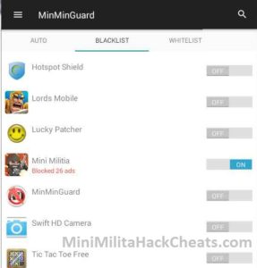 - Now open MinMinGuard . Then go to Blacklist and turn on for mini militia ads blocking.